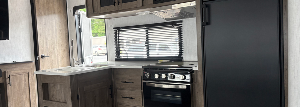Living Area: The interior includes a living area with seating, often in the form of a dinette and a sofa. Some models may have slide-outs to expand the living space when parked.